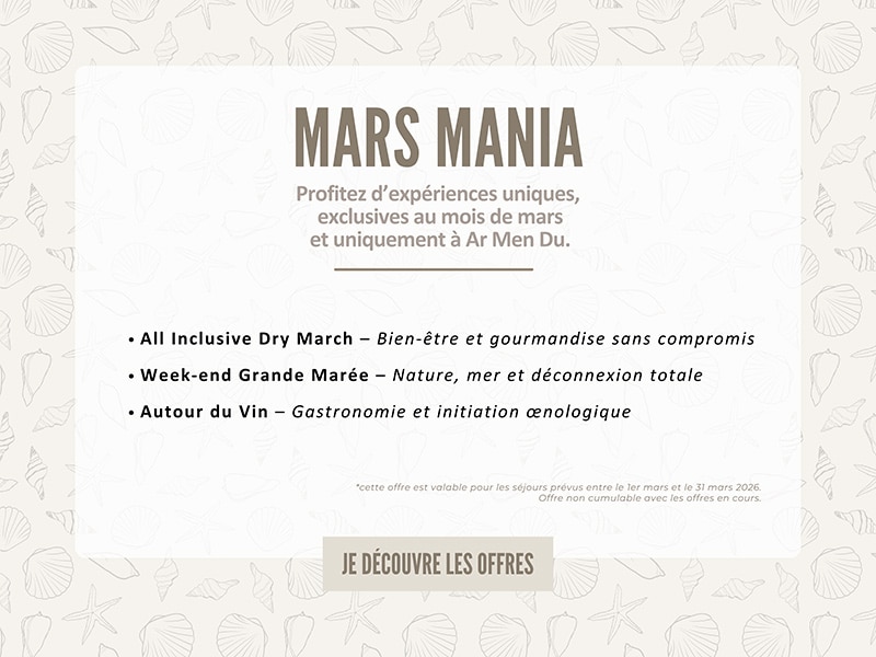 Prenez le temps de vivre au rythme de Névez lors d’un séjour mémorable à l’hôtel Ar Men Du. Profitez du confort d’un établissement au cœur de cette Bretagne authentique, à proximité immédiate des plus belles plages, des villages de chaumières et des sentiers côtiers les plus spectaculaires. Pour un voyage entre nature, patrimoine et gourmandise, choisissez la tranquillité offerte par un écrin exceptionnel en bord de mer.